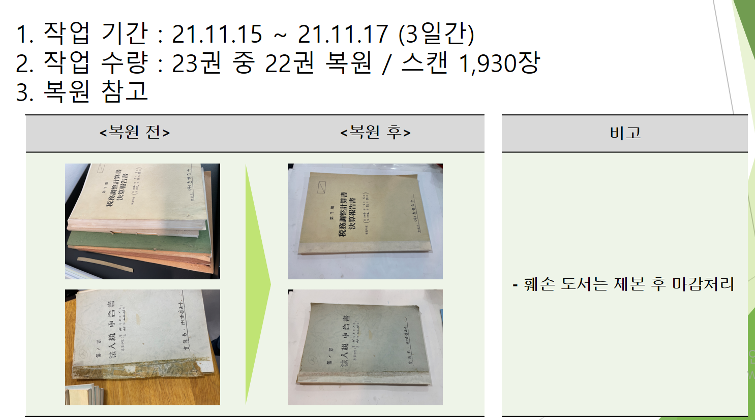 - 문서 형태 : 감사결과보고서, 세무조정계산서 등 회계자료(서적)